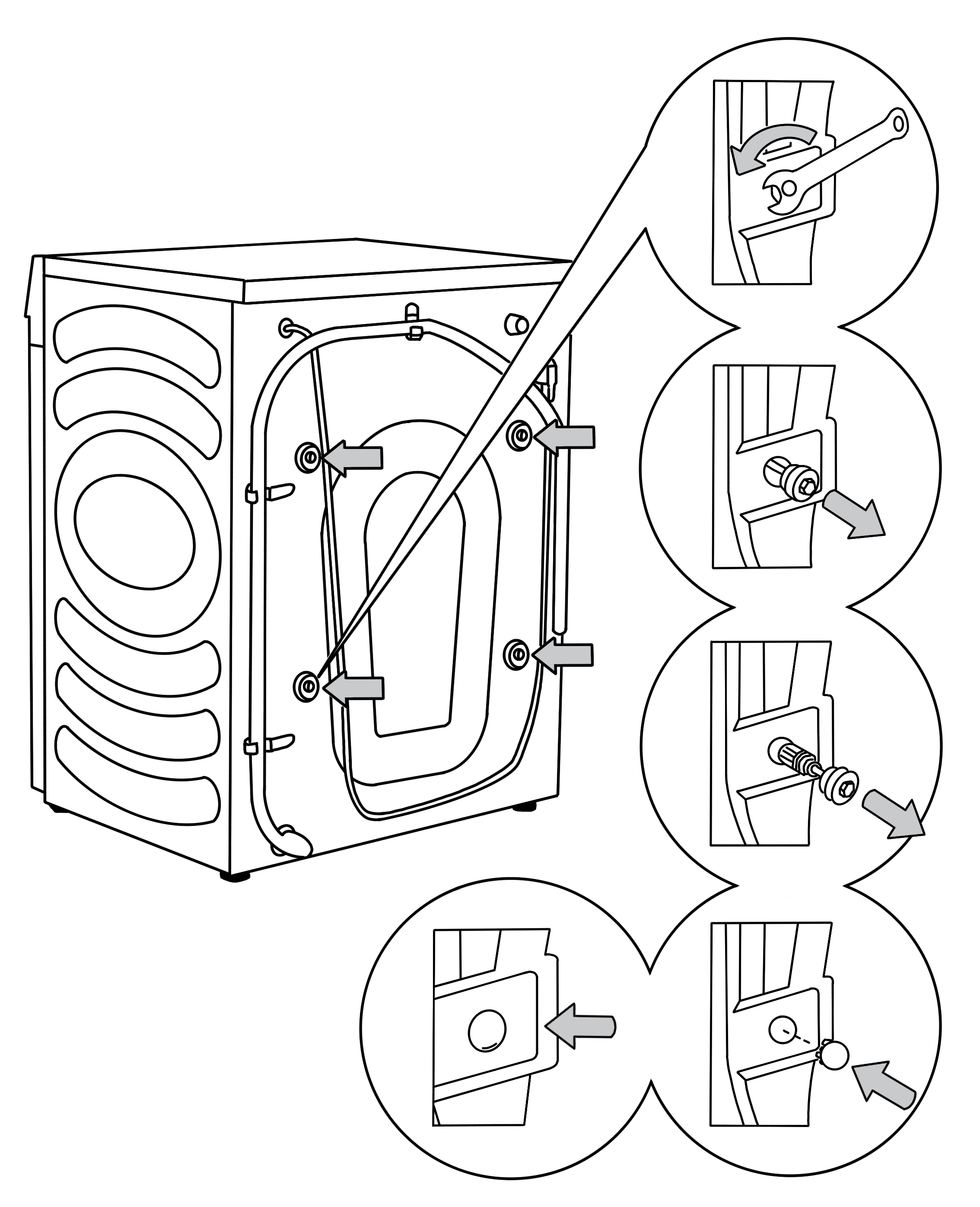 Let er vóór eerste gebruik van de wasdroogcombinatie op dat de transportschroeven/ -stangen verwijderd worden. Een geblokkeerde machine kan beschadigd worden als deze de eerste keer wordt ingeschakeld. Bij zulke schade zal de garantie niet geldig zijn. Bekijk de handleiding van jouw wasdroogcombinatie om te zien hoe je deze transportschroeven en/of stangen moet verwijderen.